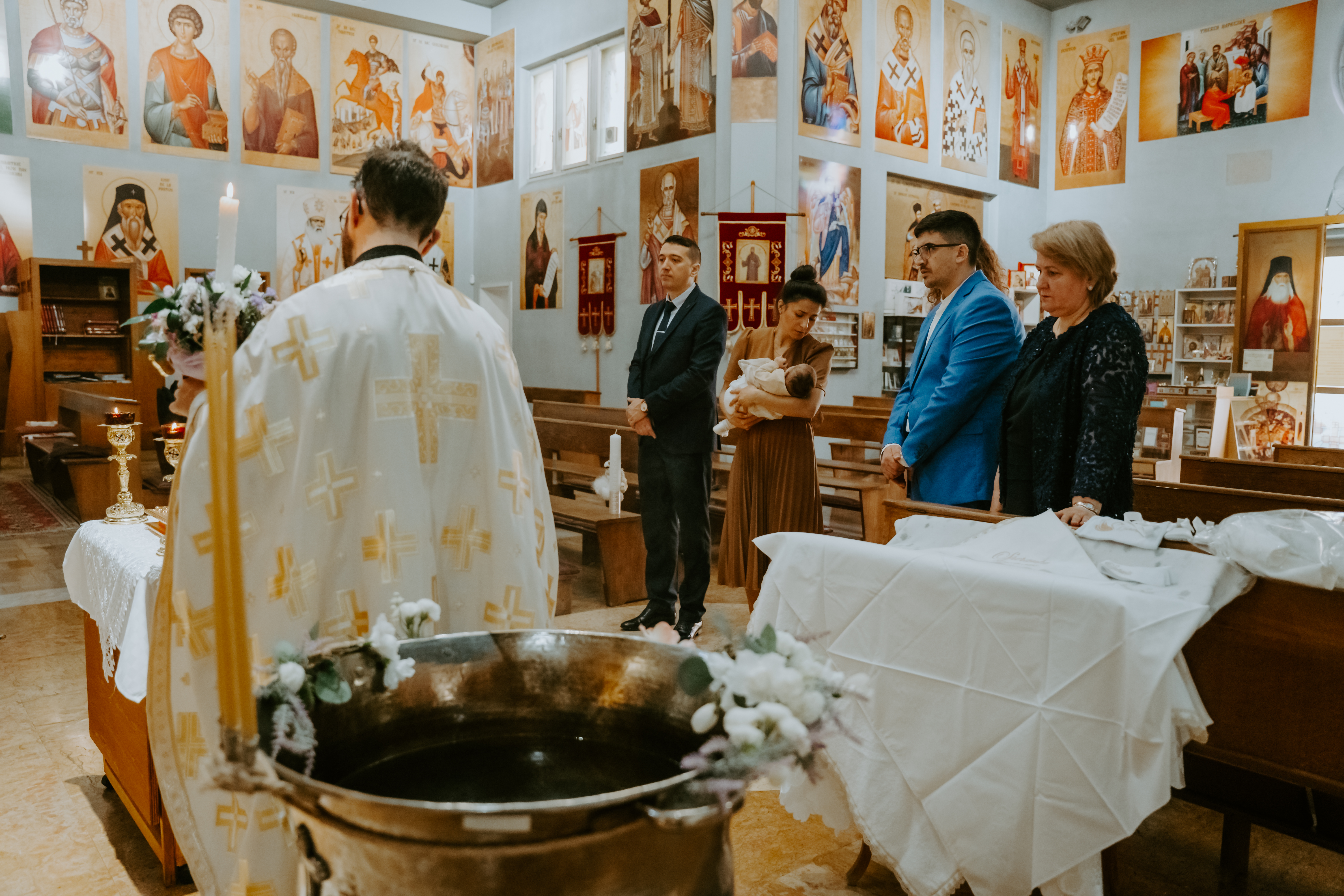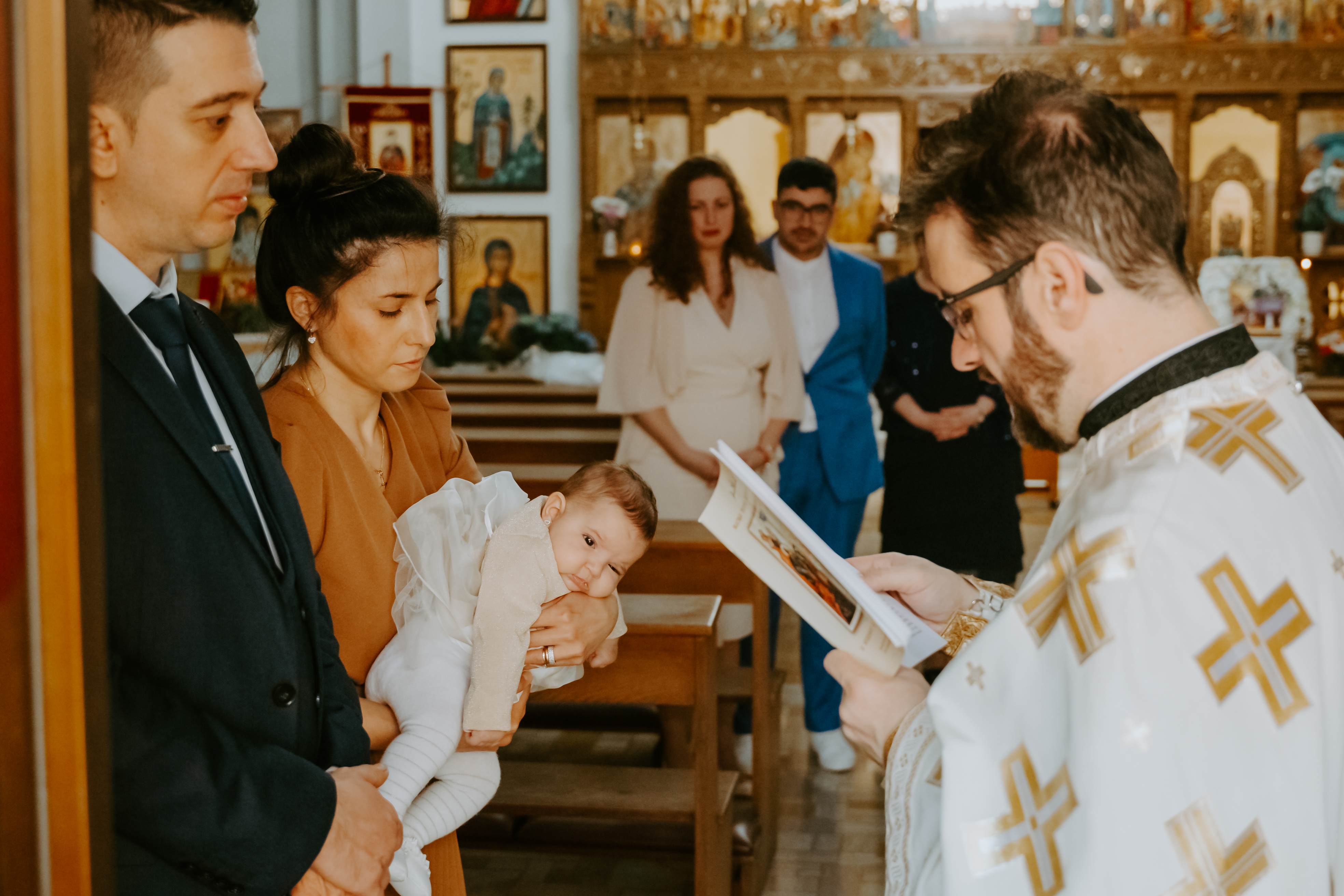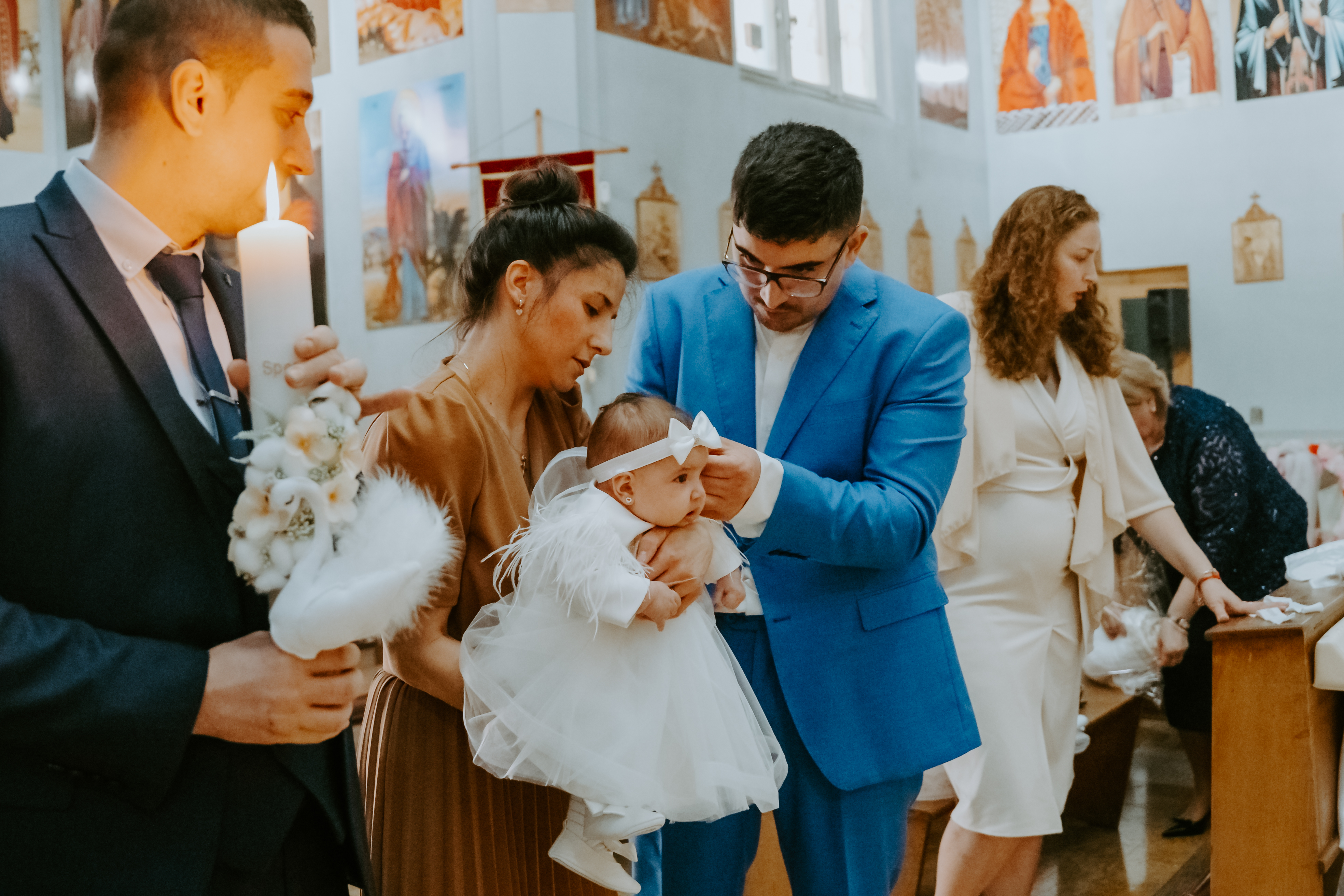 Varcare la soglia della chiesa è stato come entrare in un altro tempo: le icone dorate che brillavano nella penombra, il profumo intenso dell’incenso che avvolgeva l’aria, i canti sacri che elevavano lo spirito. Con la mia macchina fotografica ho cercato di danzare silenziosamente tra questi elementi, catturando ogni dettaglio che parlasse di questo momento: gli sguardi carichi di amore dei genitori, la sacralità dei gesti del sacerdote, la luce tremolante delle candele che illuminava i volti.