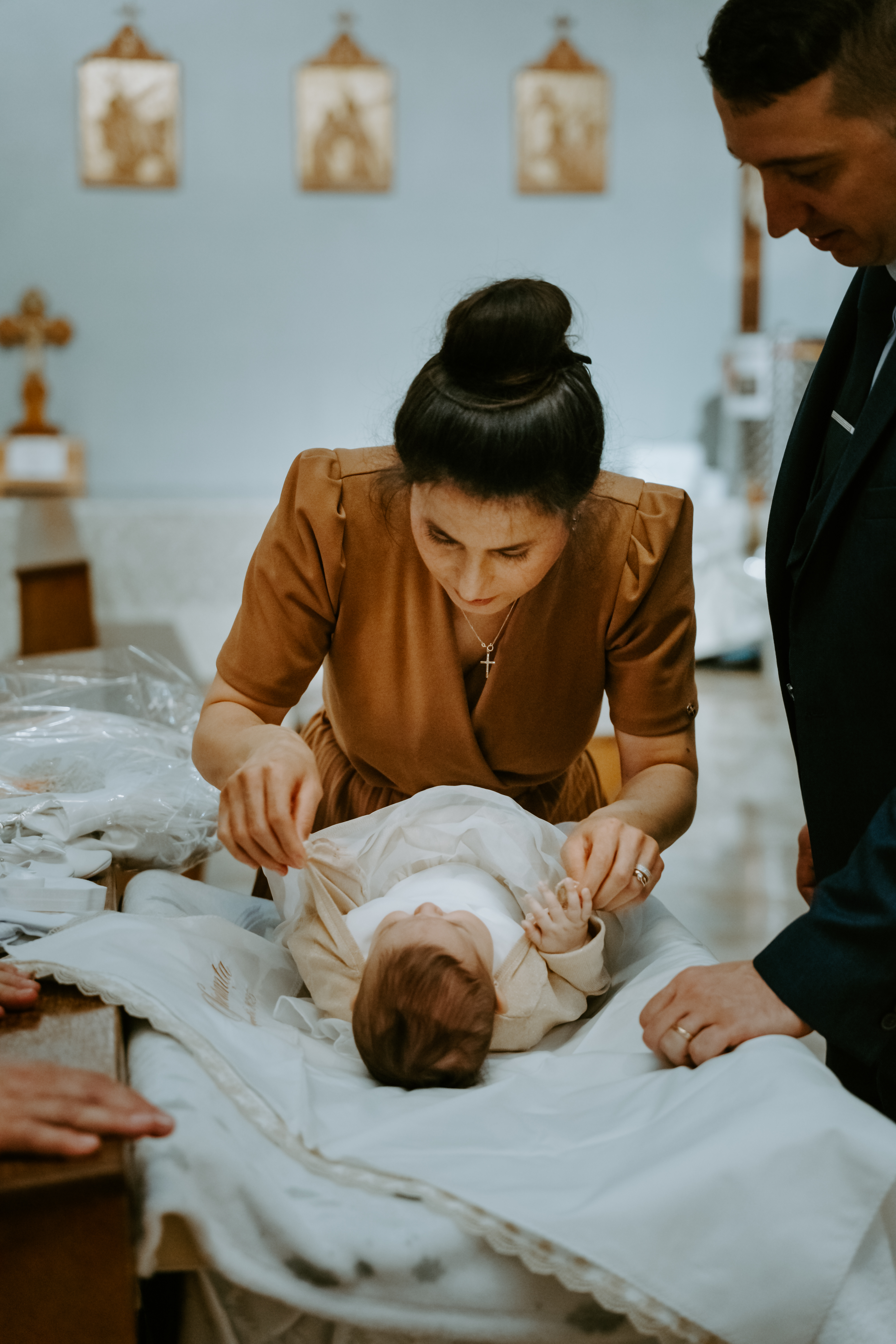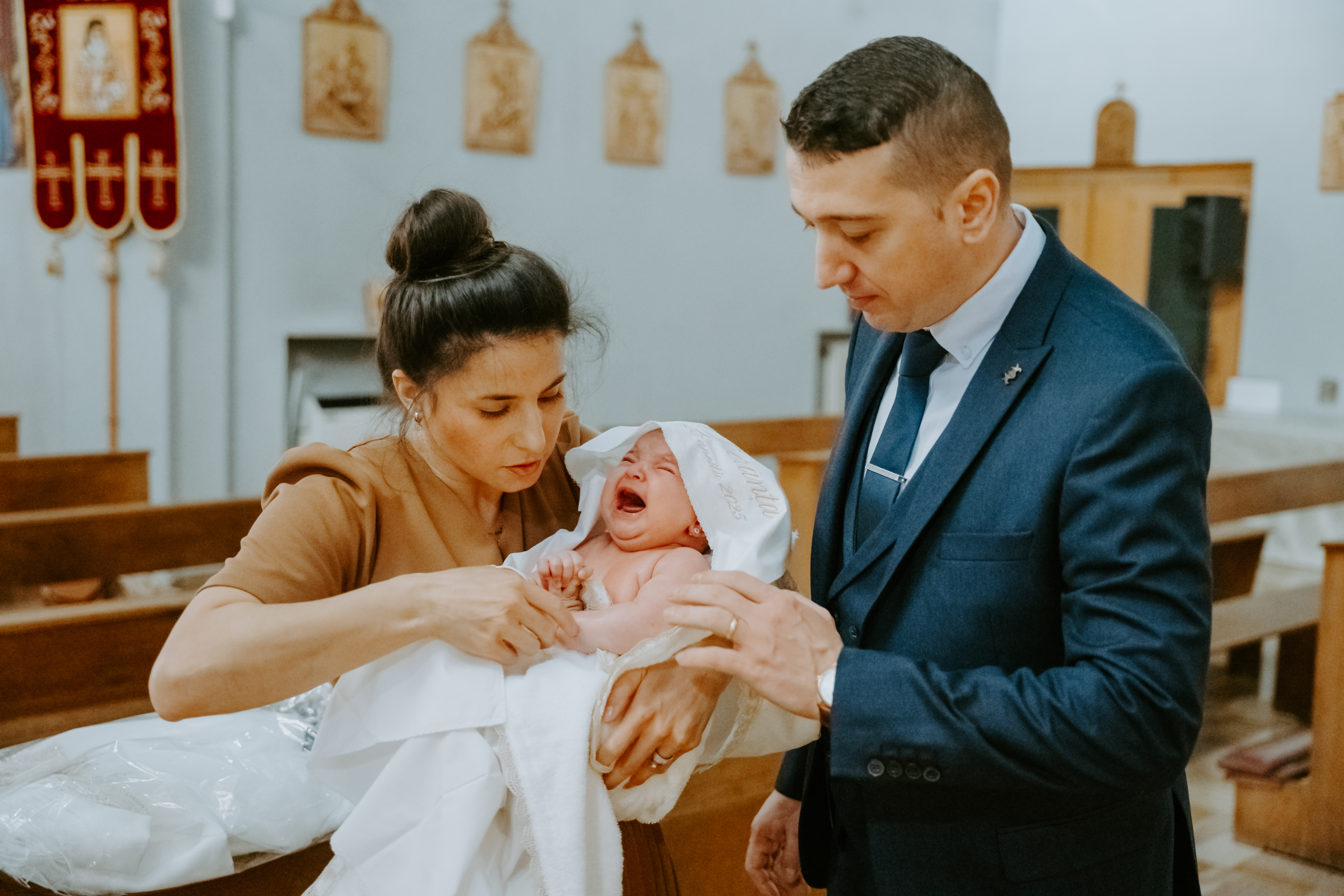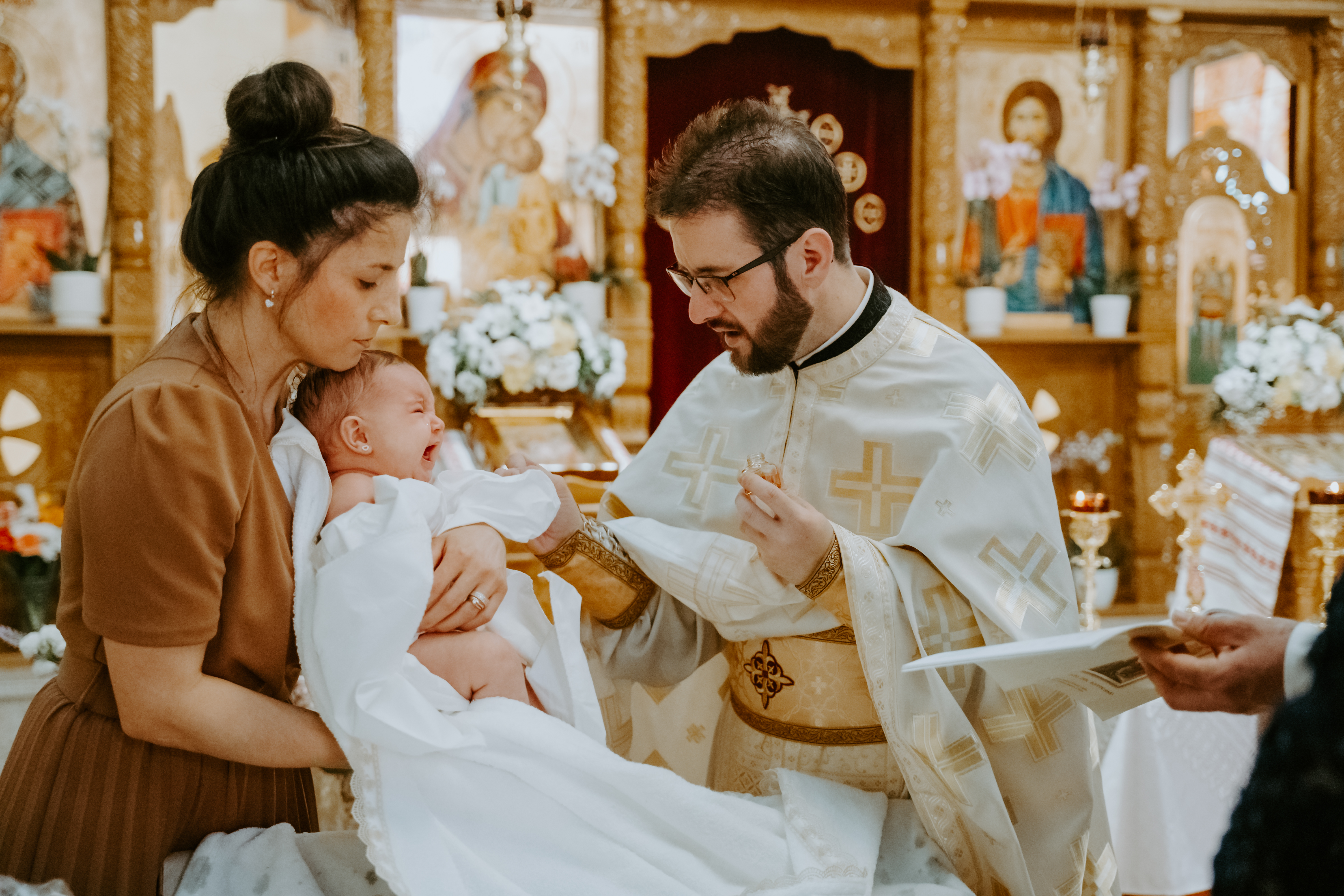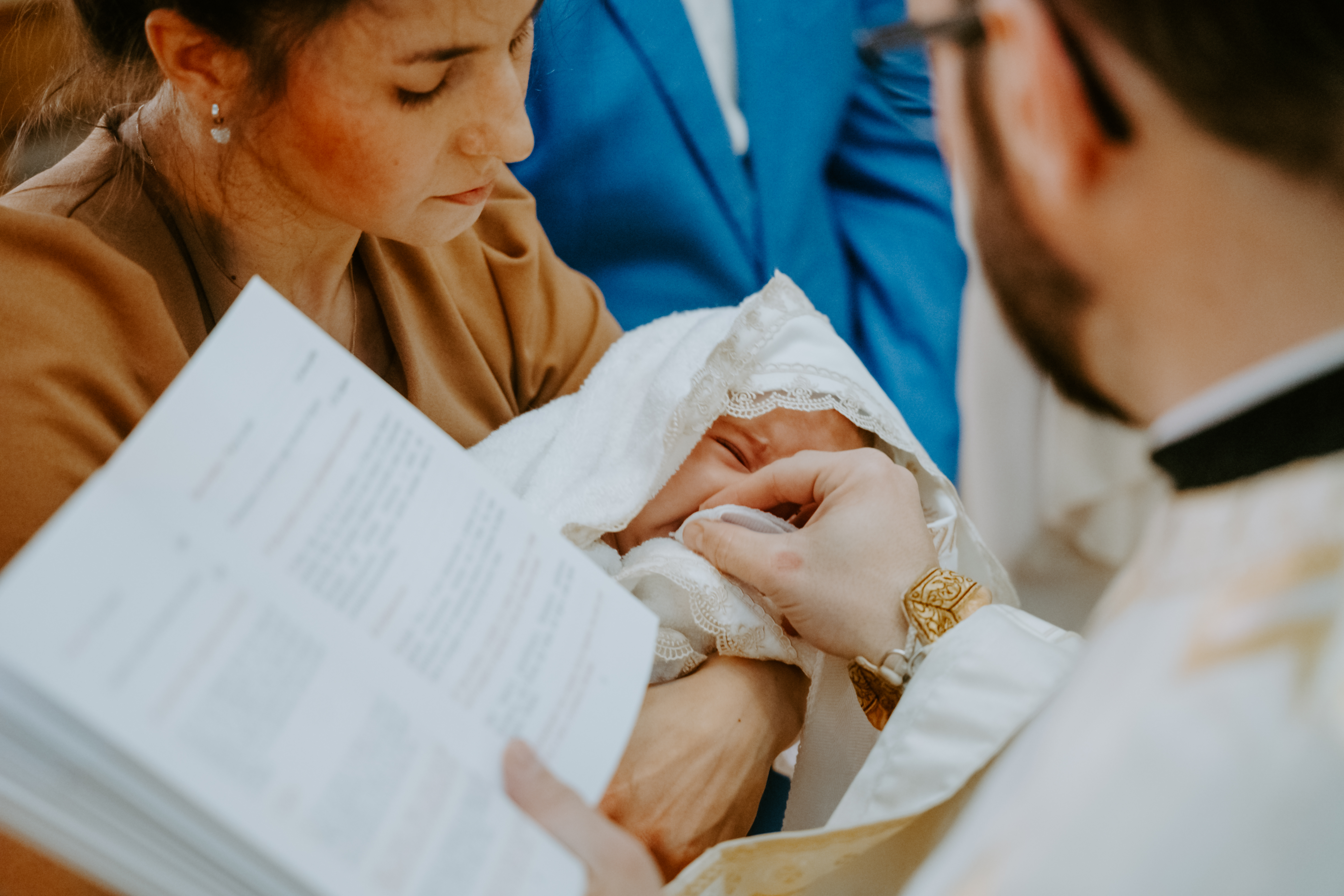 Varcare la soglia della chiesa è stato come entrare in un altro tempo: le icone dorate che brillavano nella penombra, il profumo intenso dell’incenso che avvolgeva l’aria, i canti sacri che elevavano lo spirito. Con la mia macchina fotografica ho cercato di danzare silenziosamente tra questi elementi, catturando ogni dettaglio che parlasse di questo momento: gli sguardi carichi di amore dei genitori, la sacralità dei gesti del sacerdote, la luce tremolante delle candele che illuminava i volti.