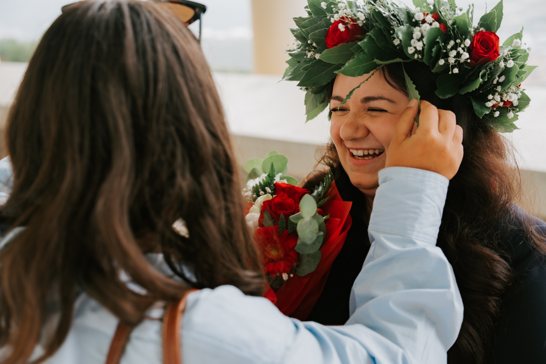 Oggi ho fotografato un momento particolarmente toccante: un’amica di Majda, già laureata, ha strappato una foglia dalla corona di alloro che portava sulla testa per donarla alla neo-dottoressa.